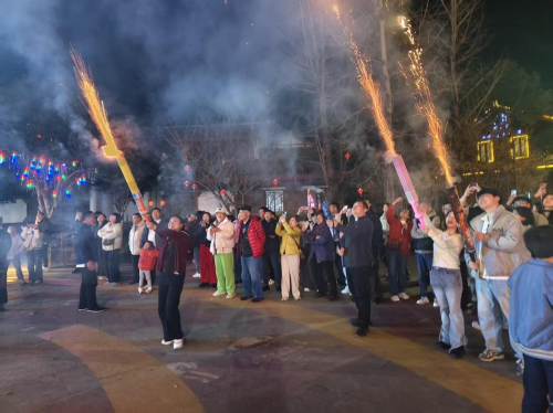 饭后,景区演出精彩上演,苗家儿女用歌舞讲述着这片土地的故事。演出结束后,熊熊篝火在广场中央点燃,火光映红了每一张笑脸。车友们手拉手,围着篝火载歌载舞,欢声笑语响彻夜空。与此同时,璀璨的烟花在头顶绽放,将这个春节假期的最后一夜装点得如梦如幻。