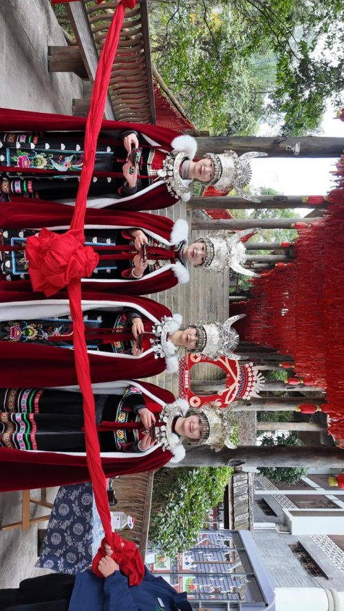车队刚抵达阿依河,热情的苗家儿女早已盛装以待。一碗拦门酒,是苗乡最诚挚的欢迎仪式。车友们接过酒碗,一饮而尽,在醇香的米酒中正式踏入这片被年味浸润的土地。苗乡的热情,从踏进景区的那一刻就已扑面而来。