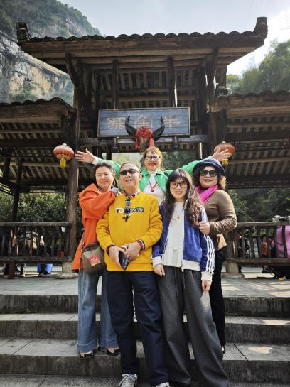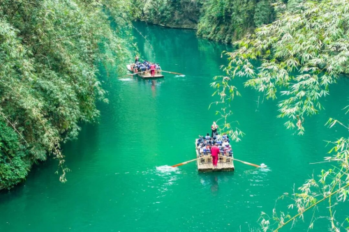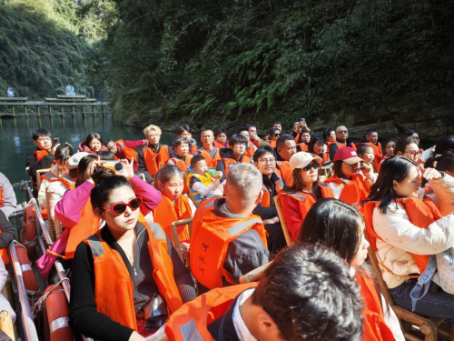 阿依河景区内处处是景,步步有戏。车友们白天穿梭于峡谷之间,乘坐“竹筏放歌”泛舟江上,在碧波荡漾中聆听苗家山歌的回响;参与欢快的竹竿舞互动,在竹竿开合间跳跃欢笑,用镜头定格一个个被年味“包围”的笑脸。