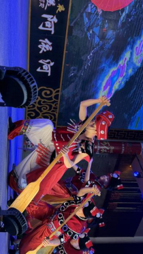 当夜幕降临,阿依河的年味在灯火中愈发璀璨。苗家敬酒歌响起,长桌宴正式开席。车友们围坐在长长的餐桌旁,品尝地道的苗家美食,米酒斟满、歌声不断,“高山流水”的敬酒礼将现场气氛推向第一个高潮。